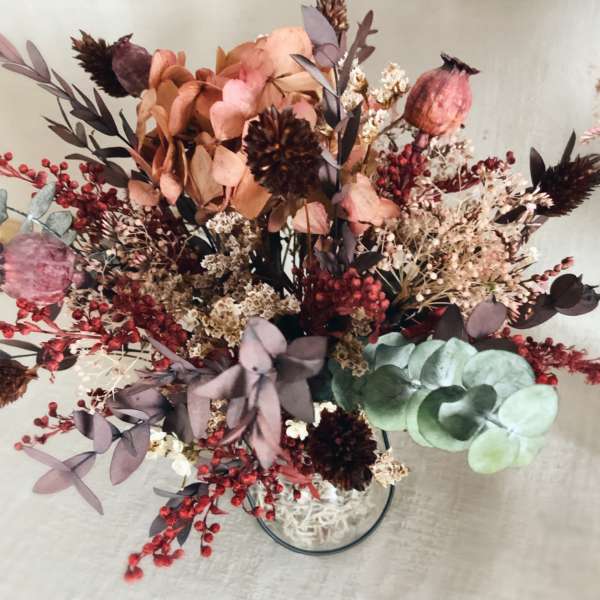 Ce joli bouquet de fleurs éternisées, dans son vase inclus, trouvera aisément une place dans vos intérieurs. Avec ses notes chatoyantes, ponctuées de brun et de vert, il nous rappelle la chaleur d’un automne bien entamé.