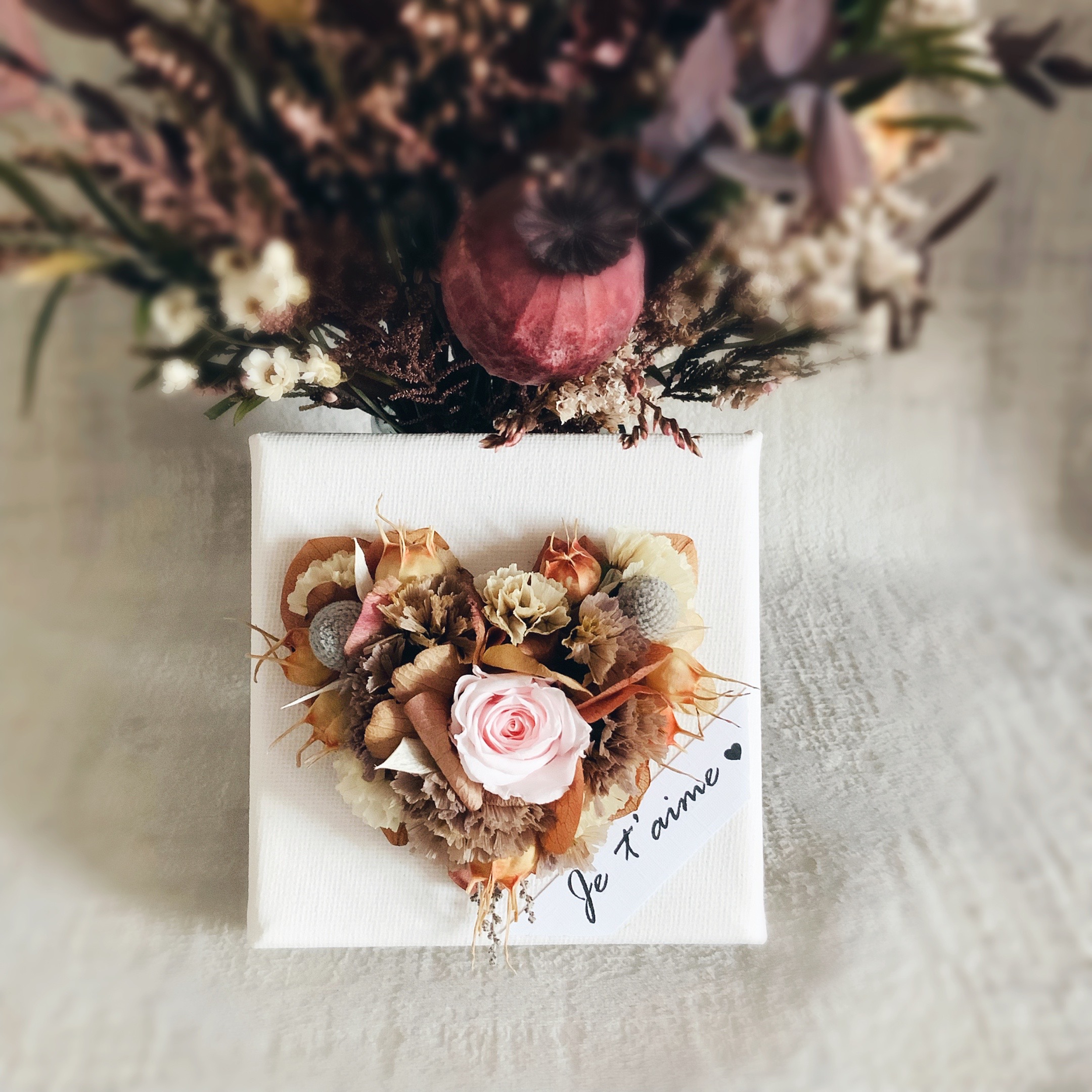 D’autre part, constitué très majoritairement de fleurs et plantes naturelles stabilisées, ce coeur fleuri restera intact durant des années, gage de son amour éternel.