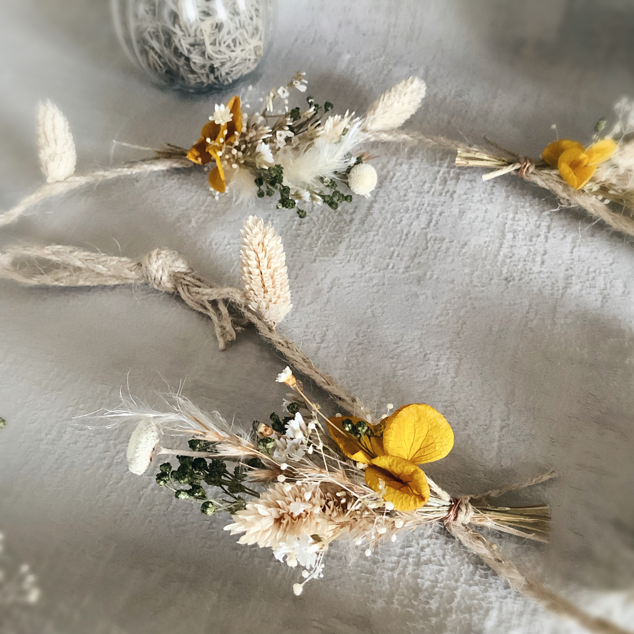 Suspendu à un mur ou en guise de tête de lit, les possibilités sont multiples. Constituée de 6 bouquets de fleurs naturelles et d’éléments séchés greffés sur un cordon tressé en lin.